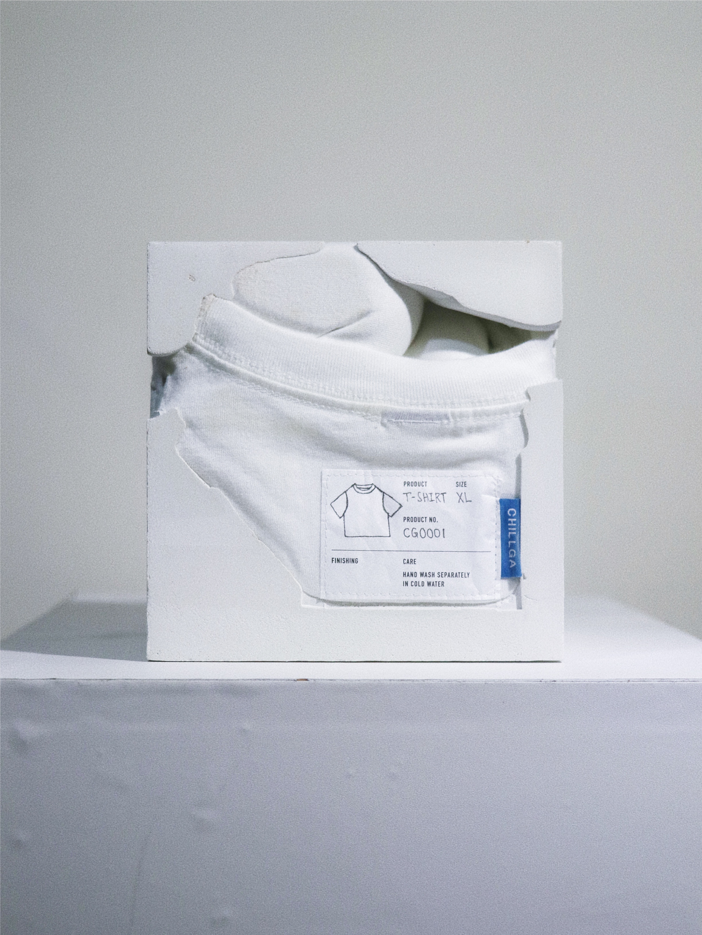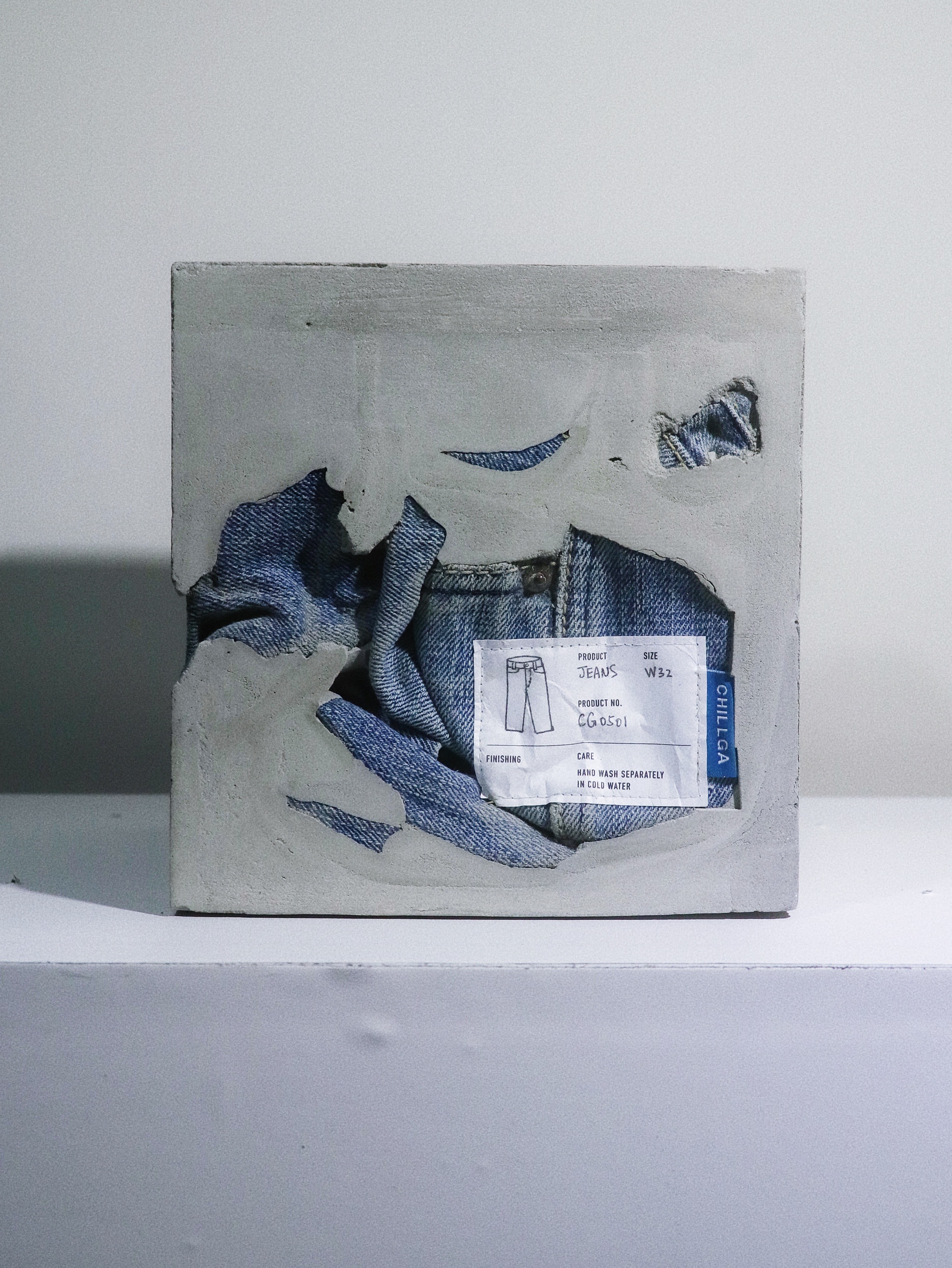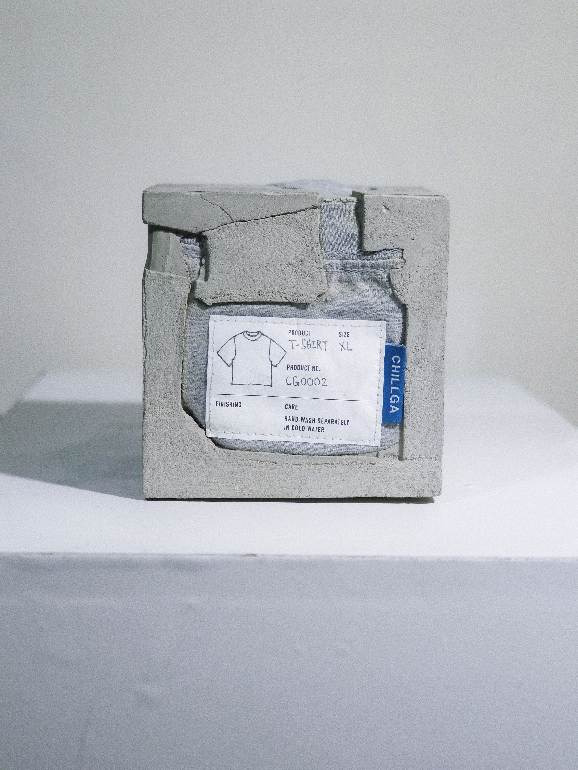 CHILLGA envisions breaking away from the ordinary. In 2021, for the first time, I dismantled and reconstructed clothing with cement to create a new look. This ongoing series continues to explore the possibilities of clothing beyond the confines of the body, incorporating canvases, sculptures, and various processing techniques. It reflects on the relationshi between people and objects, reinitiating a new dialogue.